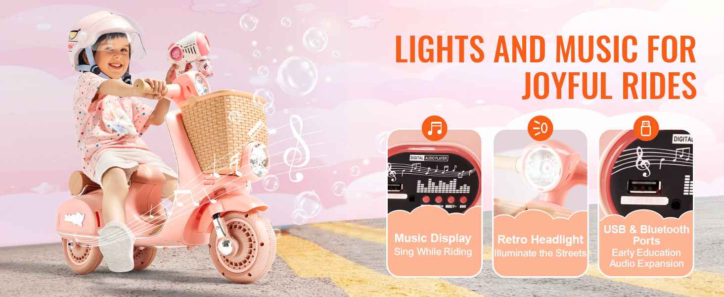 Exciting Functions:This ride-on motorcycle offers an exciting experience with its sleek design and engaging entertainment features; Bright LED lights and lively music add extra fun to every ride.